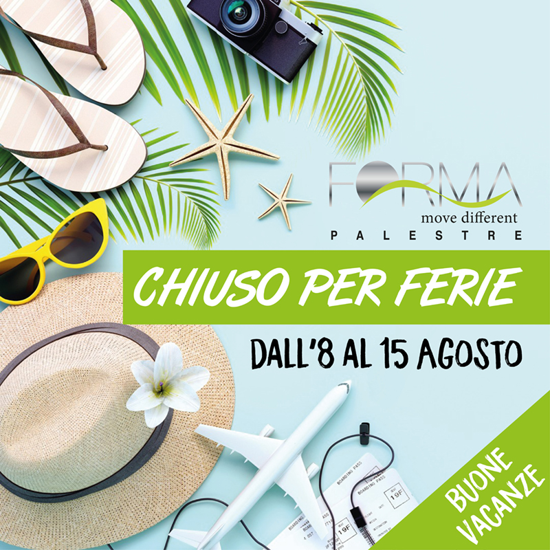 04 Ago2022 Chiuso per ferie dall’8 al 15 Agosto Il team forma va in vacanza…. Vi aspettiamo il 16 agosto pronti per ripartire con un un altro anno ricco di tanto sano movimento