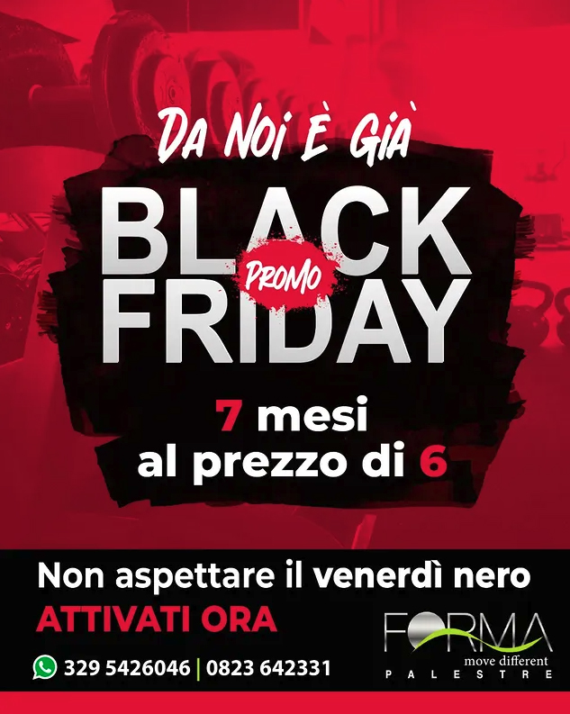 21 Nov2025 master 0News Da noi è già BLACK FRIDAY!!! ✨ Da noi è già BLACK FRIDAY!!! 🖤🔥 7 mesi al prezzo di 6!⏳ Non aspettare il Venerdì Nero… attivati ora! Per info passa in palestra oppure contattaci:📱 WhatsApp: 329 5426046☎️ 0823 642331 #BlackFriday#PromoPalestra#OffertaSpeciale#FitnessTime#AllenatiConNoi#FormaPalestre#Wellness#GymLife#Sconto#Imperdibile